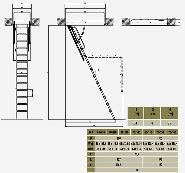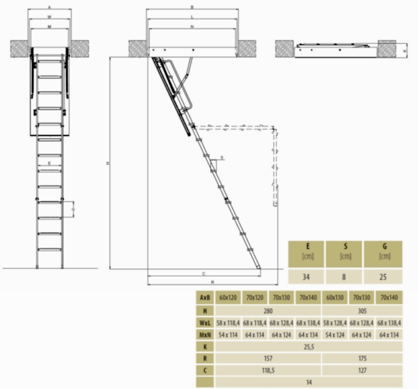 Bu merdiven modeli standart olarak 120×60, 70×120, 70×130, 70×140 cm ebatlarında üretilir. Ağırlığı yaklaşık 38 kg’dır. Fakro LMK metal çatı merdiveni, montajı kolay ve kullanımı güvenlidir. Çatıya erişim gerektiren evler, ofisler veya depolar için popüler bir seçimdir.
